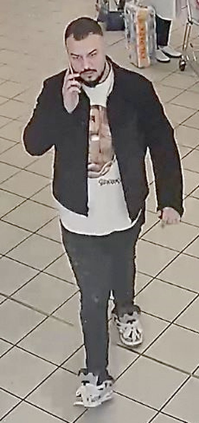 - schwarze Jacke, weißes Shirt mit Applikation auf der Vorderseite, weißliche Turnschuhe, dunkelfarbige Jeanshose