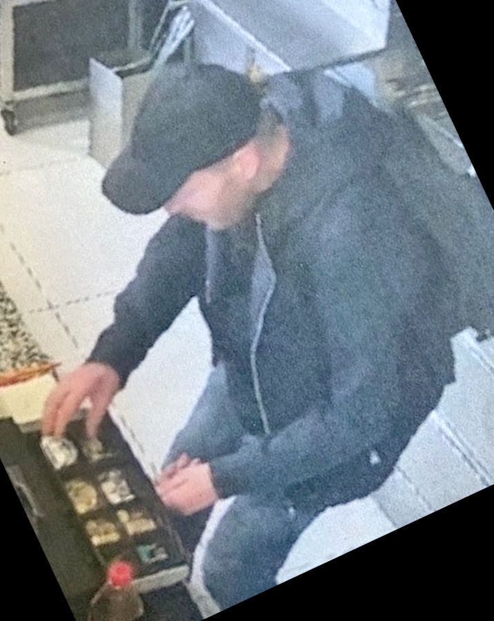 Der abgebildete unbekannte männliche Tatverdächtige betritt das Schnellrestaurant und entwendet hier Bargeld aus der Kasse.